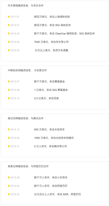 天天果园接受京东投资入驻京东官网、易果生鲜接受阿里巴巴投资入驻天猫、每日优鲜接受腾讯投资入驻美团和百度外卖等销售渠道、中粮我买网接受百度投资。