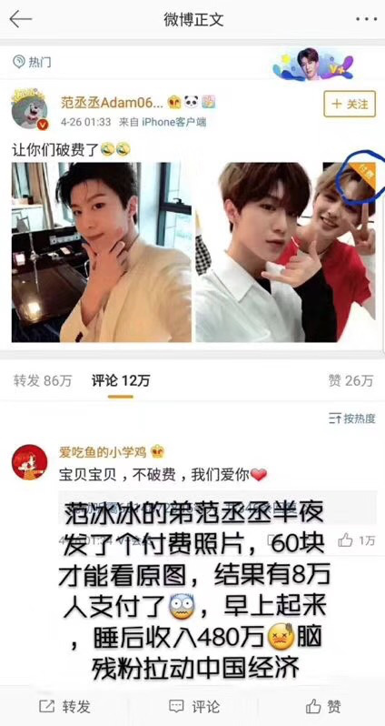 5月3日消息:范丞丞在微博晒了两张自拍照。但是照片要付费才能点开看高清版本。一张自拍照,一张是和朱正延的合影,并配文:让你们破费了!点开照片果然就是要付费,而且还不便宜,看过的粉丝表示看一次的价格是 60 元,否则就只能看糊的。结果有八万人付款,一觉醒来就赚了 480 万。