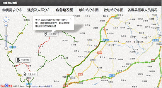 (芒果)4月24日,百度地图今日推出雅安地震救灾动态图(http://zhidao.baidu.com/topic/yaan),地图中可及时显示灾区物资需求分布、灾区路况、献血站、救助站、灾民分布等信息,或将成为灾区物资调配的参考。
