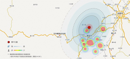 强度及人群分布图则参考地震局数据,基于震前24小时信息,百度地图对灾区用户网络定位的数据分析而绘制,并以1小时为单位进行高频更新,可从宏观上及时监测灾区灾情和人群分布。