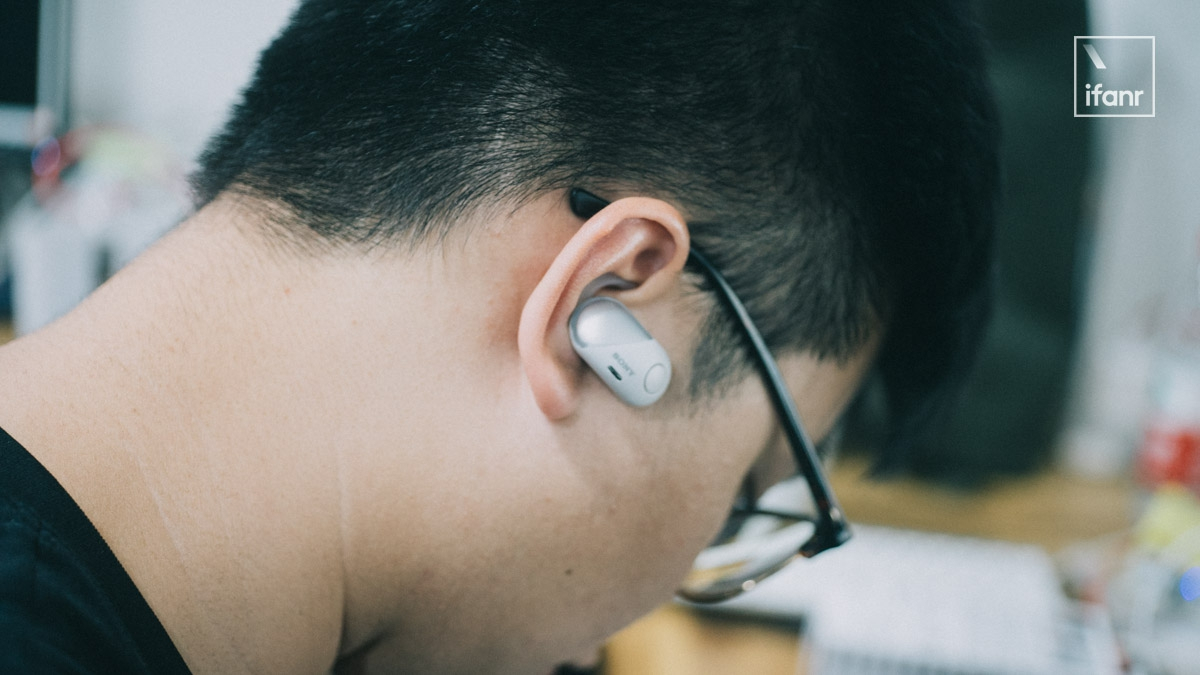 这个结构其实在索尼的 AS 运动耳机上已经有过尝试了,索尼这次的设计优化也做得不错,带到耳朵上不需要太多调整,只要让月牙结构顶入耳朵的凹槽里面,WF-SP700N 就很稳了。