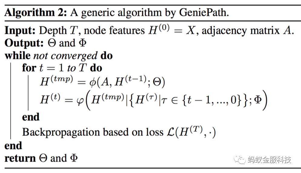 这样,问题变成了如何为每个目标节点探索某个重要的子图。GeniePath通过定义两个parametric函数:自适应广度函数、和自适应深度函数,共同对子图进行广度、深度搜索。其中自适应广度函数限定朝哪个方向搜索重要节点,自适应深度函数限定搜索的深度,即是1跳邻居信息就足够了,还是需要多跳邻居信息。
