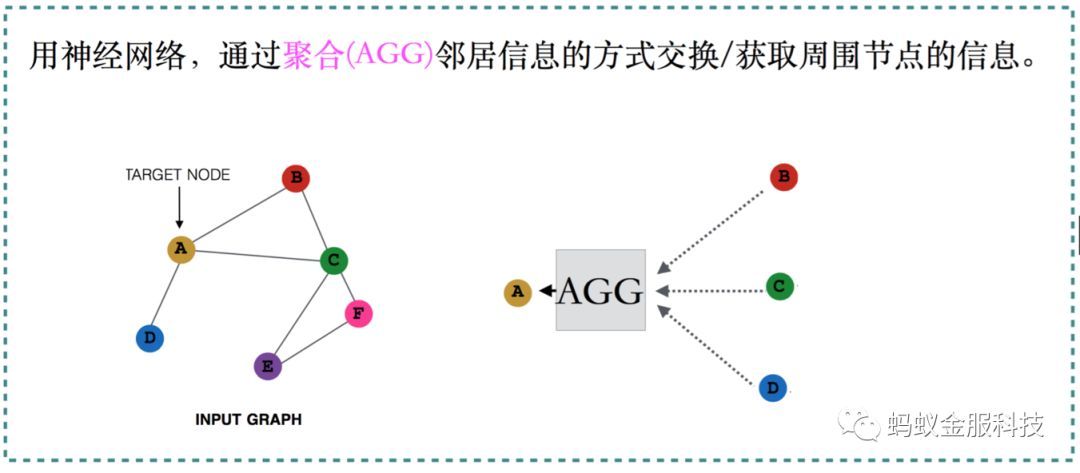 在拿到图和行为特征后,一个自然的选择是Graph Neural Networks (GNNs) [1]算法。GNNs是一类能够学习图中节点信息的算法。GNNs算法中的每个节点,通过学习自己邻居的特征,不断循环,更新自己原本的特征。在几轮更新之后,图中的节点就会包含周围很多邻居的信息。即在第k次更新中,节点v的信息为: