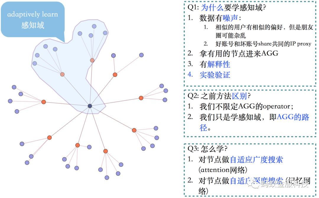 以上图神经网络存在的共同特点是:这里面定义的AGG算子,是对T跳内所有邻居做AGG,且以固定的权重做AGG。我们称计算一个节点的embedding所需的“邻居”为感知域。那么我们的问题是真的需要对T跳内所有的邻居都做AGG吗?