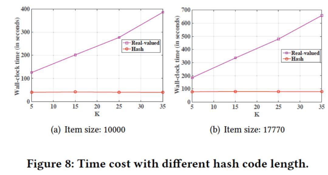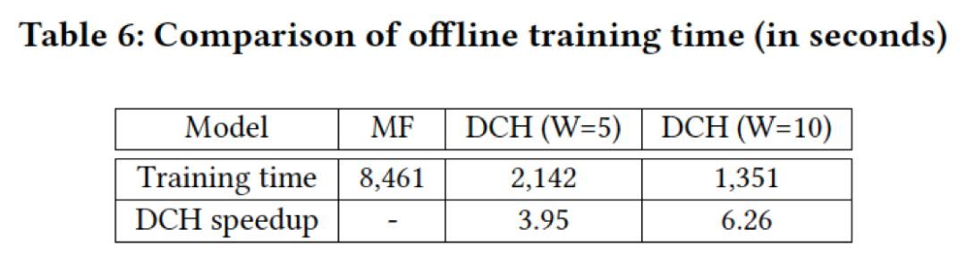 从图3和图5中可以看出,我们提出的DCH模型可以达到与现有模型效果相当的结果。从图6可以看出,我们的模型线下训练的时长得到了成倍的缩减,同时从图8可以看出,我们的模型在线上打分上,速度也比使用实数向量的方法有极明显的提升。综合而言,我们的模型通过参数服务器模型,大大降低了线下模型训练时间。同时,我们提出的模型通过牺牲微小的精度,来节省大量的线上打分排序时间。