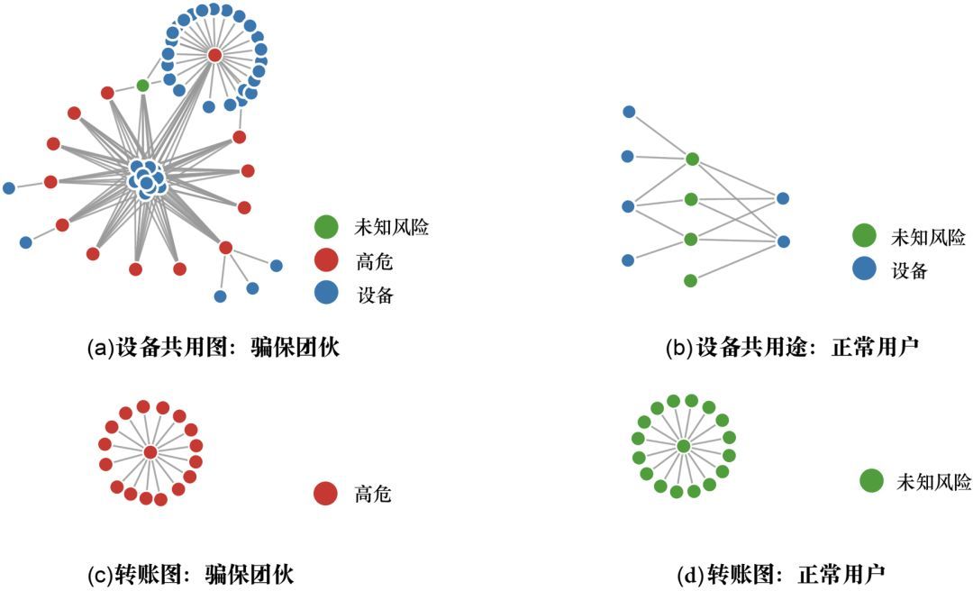 可以观察到,设备共用图中“正常用户”和“骗保团伙”的关系模式区别较大。我们最终选择了设备共用图作为构图对象。