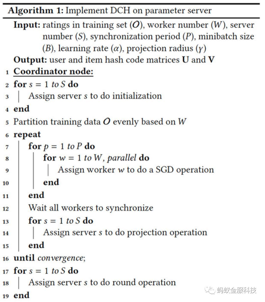 分别表示用户和物品潜在向量在t时刻的值。在实现过程中,我们使用的是阿里和蚂蚁自主研发的鲲鹏分布式学习架构,参见论文[3]。我们的算法名称是Distributed Collaborative Hashing(DCH),整个算法更新的框架如下: