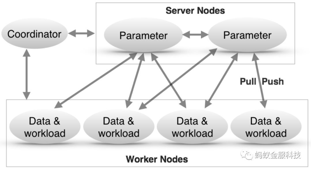 ;Worker负责加载数据并求梯度。参数服务器的工作理念可以参见[2]。