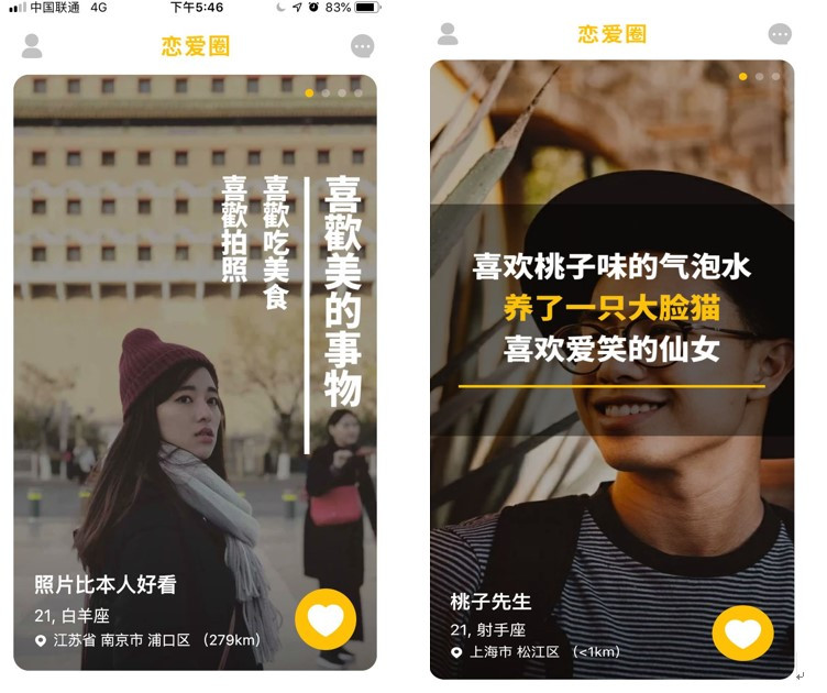 由于产品刚刚推出,可以发现目前的功能非常少,主要还是滑动照片来选人,乍一看,和探探非常相似,只是在交互上显示了一些差异化,探探是通过左划右划来选择是否喜欢,而恋爱圈只有点击喜欢这个按钮,同时左划右划的功能变成了观看其余的照片(如果个人有多张的照片的话),另外增加了封面文字。