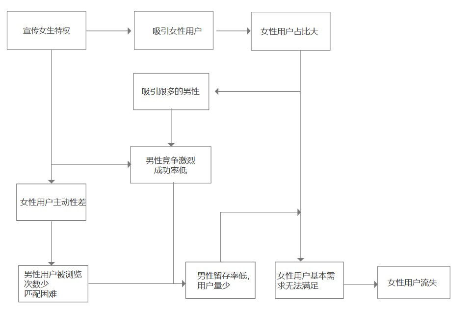 上文分析过,一款产品很难做到既满足女生需求,又满足男生需求。而恋爱圈的天平大量向女生倾斜,使得在不断积累女性客户的同时,会导致男性用户的不断流失,男性用户中能留下来的都是精英,高富帅,因为只有这群人是有产品体验感的,其他的普通用户甚至是屌丝,匹配成功的次数寥寥无几。