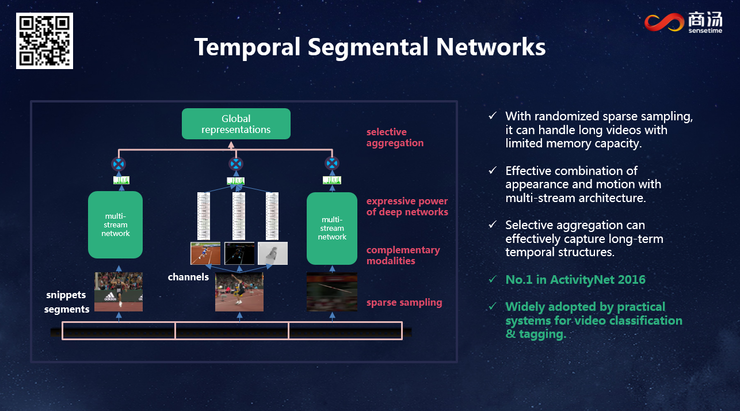我们知道,视频相邻帧之间的重复度非常高,如果每一帧都跑一次,其实大量计算资源都被浪费了。意识到这种重复计算模式的低效后,我们对采样方法进行了改变,改用稀疏采样:无论多长的视频,都划分成等长的段落,每个段落只取一帧。这样一来就能在时间上对视频形成完整覆盖,分析出的结果自然具有较高的可靠性和准确性。凭借这个网络,我们拿到了2016年的ActivityNet冠军。现在大部分视频分析架构都已经采用了这种稀疏采样的方法。
