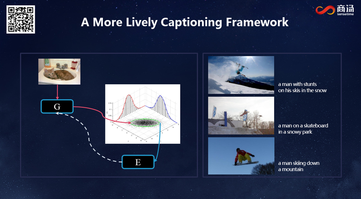 为了解决这个问题,去年我们提出了一个新方法。它不再把内容描述看成翻译问题,而是把它当做一个概率采样问题。它承认描述的多样性,承认每个人看到同一张图片会说不同的话。我们希望把这个采样过程学习出来。关于这个模型的细节,大家可以查阅相关论文。这里只展示结果:针对同样三张图片,模型生成了三句更生动、更能描述图片特征的语句。
