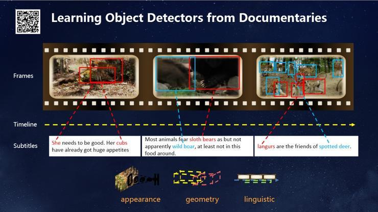 下图展示了我们去年的一项研究成果,这一成果发表在CVPR上,它尝试了一种全新的学习方式。过去图片的标注成本非常高,每张图片不仅要标注,还要把目标物体框出来。比如学习识别动物,需要人工把动物标出来。我们小时候学习辨认动物的过程不是这样的,不是老师给我一个带框的图片去学习,而是通过看《动物世界》学习的。这促使我产生了一个想法:能否让模型通过看《动物世界》,把所有动物识别出来?纪录片中有字幕,如果把它跟视觉场景联系在一起,模型是否就能自动学习?为此我们设计了框架,建立起视觉与文本之间的联系,最后得出了下图中的结果。