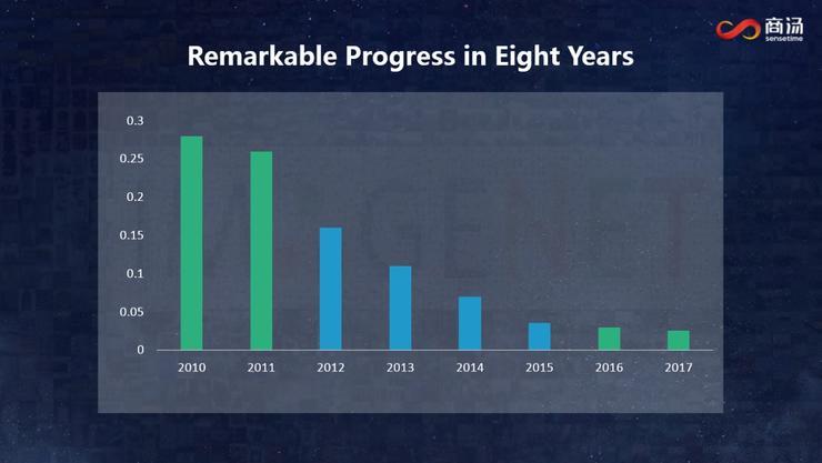 过去8年,计算机视觉可以说取得了突破性进展,其中技术上最重要的进展是引入了深度学习。这个领域有一个非常高级别的比赛——Image Net。2012年之前,这个比赛中的识别错误率比较高,2012年引入深度学习技术后,计算机视觉经历了长达4年的黄金期。这4年黄金期中,Image Net比赛中的识别错误率从20%下降到了接近3%,之后就停滞不前了,直到去年这个比赛停办。