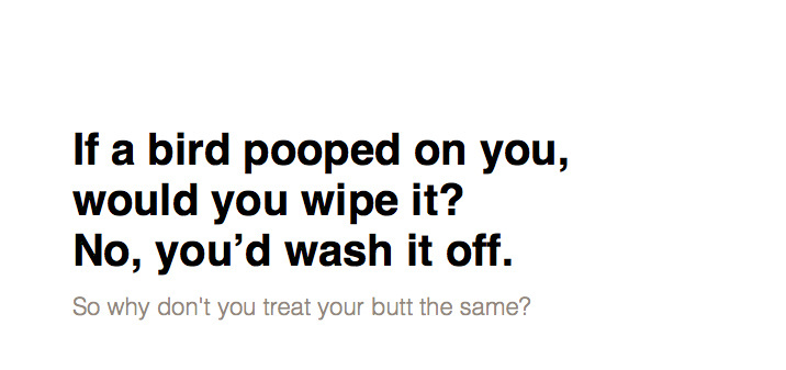 现在Argrwal和其他投资者一起推出一款叫做Tushy的厕所用具。在Tushy的边缘下方有一个小水龙头,相当于一个标准马桶座上的喷嘴,没有附带额外的盆具,也没有其他“卫洗丽”具备的新颖的功能,但是Tushy的售价仅为在69美元,它可能成为消费者在高端的“卫洗丽”和廉价的湿巾之间的这种选择。还记得上文说过,阿诺德·科恩在宣传他的Sitzbath时遇到了不少麻烦,但是自20世纪60年代以来,营销就发生了翻天覆地的变化。 Tushy的网站不会使用一些遮遮掩掩的修辞,它的广告直接了当地写到:“会排便的人们都需要Tushy”。在产品主页上,赫然一条广告标语说道:“别再擦屁股了,让Tushy帮你洗干净。” 还有一则直白的标语,“如果一只鸟在你身上拉了便便,你会只是拿纸把它擦掉吗?不,你会用水把它洗掉。”