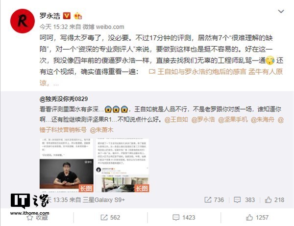 据了解,王自如早在锤子T1期间,就与罗永浩结下梁子,到目前为止双方积怨似乎依旧没有消除。昨天ZEALER发布锤子R1的评测视频,都不难看出双方依旧火药味儿十足。罗永浩在之前表示,ZEALER关于坚果R1 17分钟的评测,居然有7个“很难理解的缺陷”,对一个“资深的专业测评人”来说,要做到这样也是挺不容易的。称自己不会像四年前的自己那样,而是直接去找我们无辜的工程师乱骂一通。暗示王自如不懂技术,有专门黑坚果R1的嫌疑。
