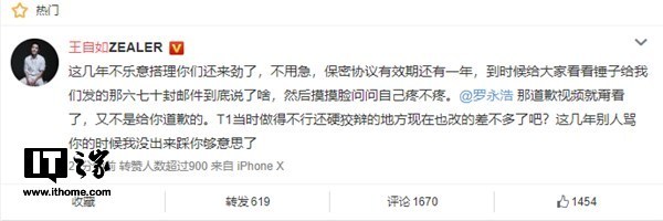 王自如在微博里表示:“这几年不乐意搭理你们还来劲了,不用急,保密协议有效期还有一年,到时候给大家看看锤子给我们发的那六七十封邮件到底说了啥,然后摸摸脸问问自己疼不疼。罗永浩那道歉视频就甭看了,又不是给你道歉的。T1当时做得不行还硬狡辩的地方现在也改的差不多了吧?这几年别人骂你的时候我没出来踩你够意思了。”