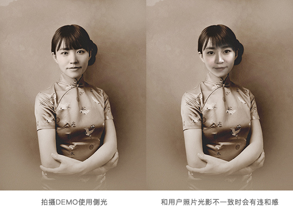 仿旧的色调也做过多种尝试。二三十年代的老照片以黑白为主,因为历久所以泛黄,细节丢失严重。直接模仿(如风格四),用户的样貌会呈现得不够好看。而彩色照片(如风格三)则是到了八十年代才初兴,年代感不够厚重。所以在优化黑白风格的基础上,减少偏黄,增强了对比度,最终选择了风格二。