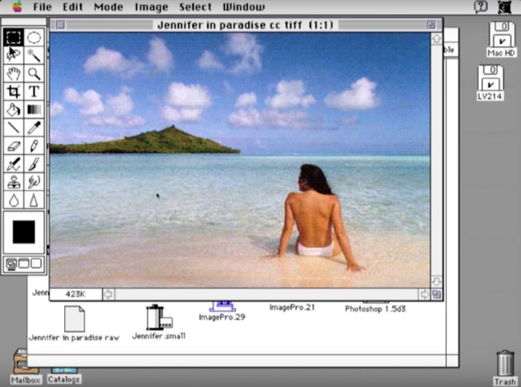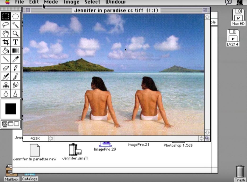 桌上摆着一台早期的苹果Mac电脑,里头用 PhotoShop 史上第一个商业版展示着史上第一张被PS的照片,一张海滩美女照片。
