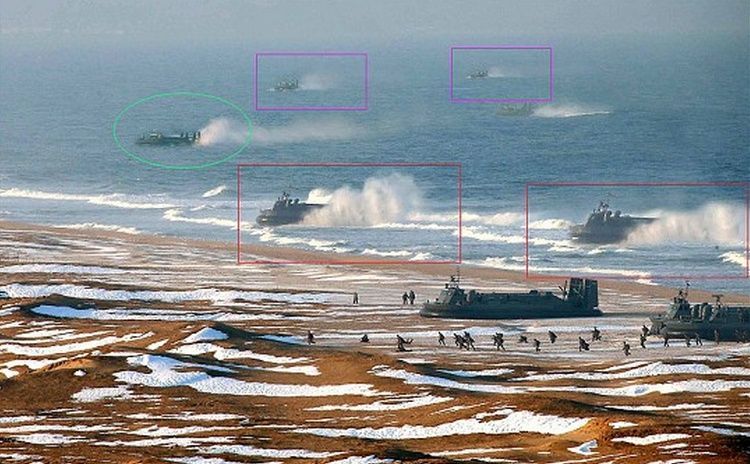 (朝鲜官方发布的军事演习照片中,眼尖的网友发现有几艘气垫船长得一毛一样)