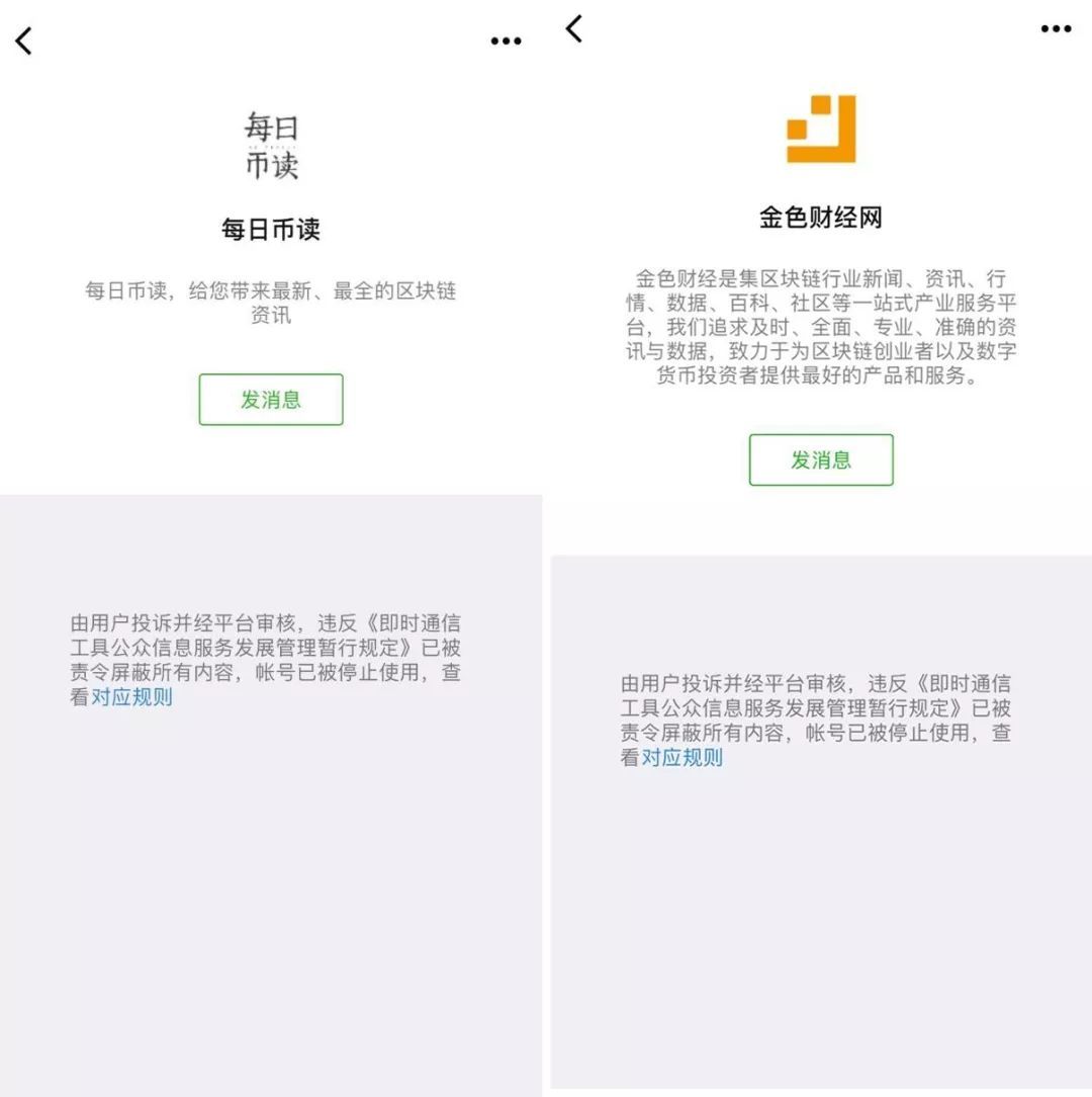 8·21之外,今年3月2日,国内两大虚拟数字币交易所OKEX和火币网同名官方公众号相继被封,至今未恢复;9月7日,也有一批区块链微信公众号被封停,包括点币成金、王子区块链、区块链第一哥、阿凡提等。