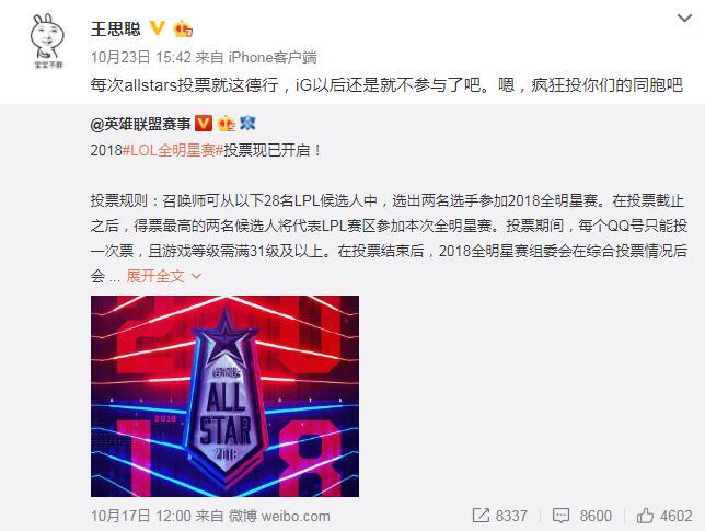 站长之家(ChinaZ.com) 10月24日 消息:2018 年《英雄联盟》全明星赛投票已于 10 月 23 日截止,投票结果落定后,王思聪发微博怒怼全明星投票,为Rookie鸣不平。他吐槽称“每次全明星投票都这德行,以后iG就不参与了吧,嗯,疯狂投你们的同胞吧”。