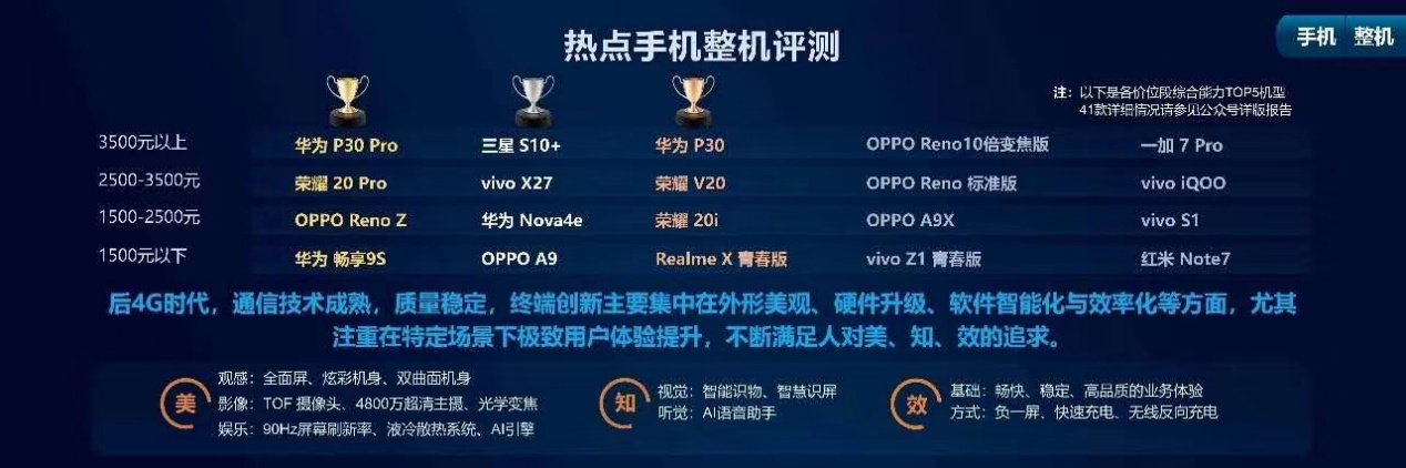 据中国移动最新发布的2019年智能硬件质量报告显示,华为 P30 Pro手机获得了综合评测排行榜3500+档位的冠军,第三名是华为 P30。在拍照和视频专题评测和游戏专题评测中,P30 Pro获得了3500+档位五星。
