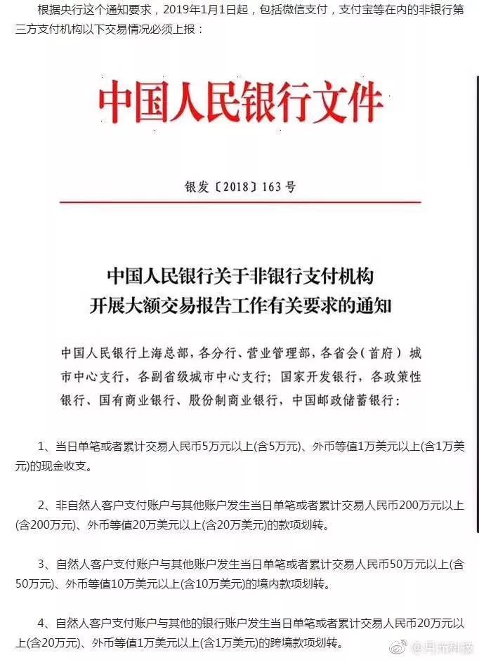 据悉,央行发布了《中国人民银行关于非银行支付机构开展大额交易报告工作有关要求的通知》(银发〔2018〕163号)。根据该通知要求,2019年1月1日起,包括微信支付,支付宝等在内的非银行第三方支付机构以下交易情况必须上报: