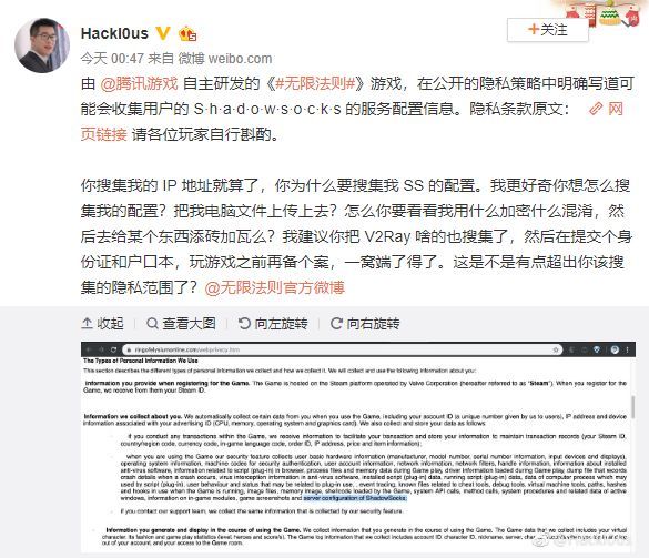 今天凌晨,微博用户Hackl0us质疑腾讯《无限法则》游戏,认为其隐私策略中包含“可能会收集用户的shadowsocks服务配置信息”的行为涉嫌过度搜集用户隐私信息,超出了一款游戏理应搜集的隐私范围。