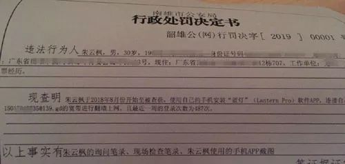 Shadowsocks软件主要用于代理服务器翻墙,用户如果使用被查出来可能会遭到行政处罚,今年年初,广东省南雄市公安局网监大队开出1张行政处罚决定书,30岁的朱云枫因自2018年8月至12月在手机上安装翻墙软件上网而被罚款1000元,处罚事由是“擅自建立、使用非法定信道进行国际联网”。