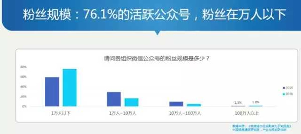目前行业已经符合幂率定律。据腾讯统计 2017 年 1.8% 的公众号粉丝超过百万,还有 76.1% 多的号粉丝数小于 1 万。