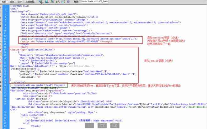 这里通过群友的分享,这里直接有一段织梦的Json_LD代码,将下面这段代码加入到之内,然后将代码出现“您的移动域名”修改为你自己的移动站点域名即可!将“您的主站”,替换成你PC域名即可,是为了调用图片完整地址的。