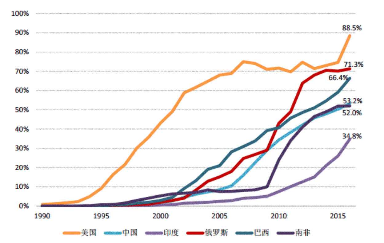 金砖国家与美国互联网渗透率比较,数据来源:世界银行、CNNIC、internet live stats