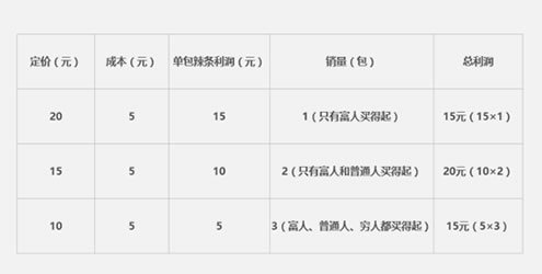 我们以天猫上一款辣条为例。假设辣条的成本是 5 元,有三个消费者——富人、普通人、穷人。购买这包辣条,富人最多愿意花 20 元,普通人最多愿意花 15 元,穷人最多愿意花 10 元。