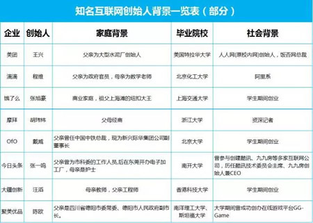 一个不争的事实是,在雷军刘强东之后,当下创业成功的一波知名独角兽创业公司里,已经很难找到草根的影子。绝大多数的创始人,他们大多出生在富裕或者高知高干家庭。家庭出身不是他们成功的唯一要素。但不可否认的是,出身提升了他们成功的概率。
