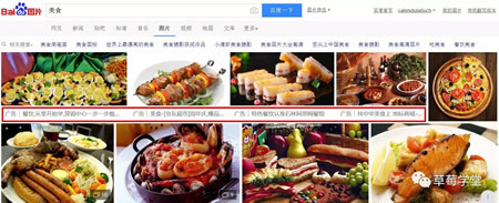 百度图片的原生广告,广告图片和其它搜索出来的图片高度一致,除了图片下面的一小行文字备注外,看不出来差别。