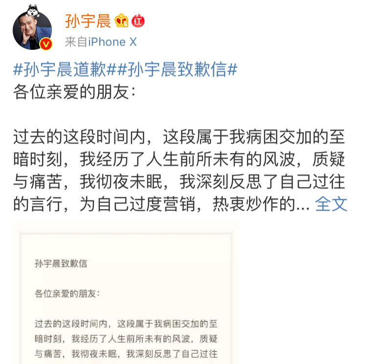 7月25日凌晨2:46,孙宇晨在个人微博发表致歉信。