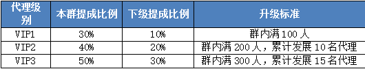 代理只发展2级,A代理初始提成为自己群总产出的30%,A代理发展B代理,B代理微信群总产出10%归A代理所有。A代理可以不断发展代理,B也可以不断发展代理,但B发展的代理只跟B有关系,与A无关。