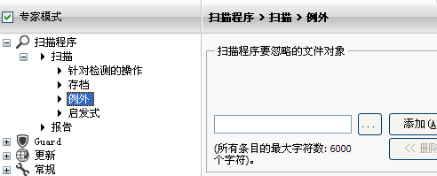 7、专家模式有一个非常有用的就是“例外”在这里你可以将一些小红伞误报的文件或者文件夹添加到例外当中,其他的功能可以根据自己对杀毒要求不同而设置,如下图: