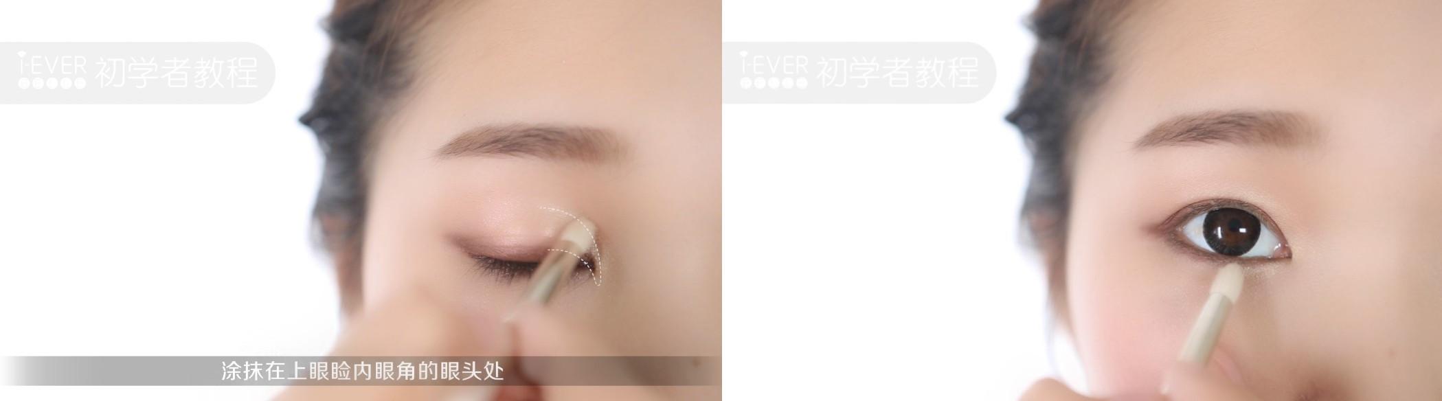 STEP4:蘸取珠光白色眼影,涂抹在上眼睑内眼角的眼头处,再提亮下眼睑卧蚕处。