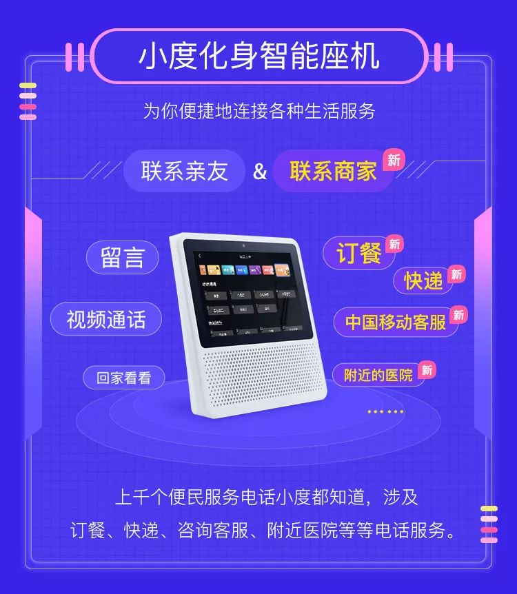 在 2019 百度 AI 开发者大会发布的「小度电话大全」是由小度团队与百度地图合作,百度地图所有的 PUI 数据被导入到了小度助手上,可以让用户在小度设备上发现附近的商家、银行和医院,并语音拨打这些机构的电话。