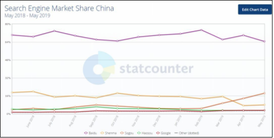 Statcounter发布的中国移动搜索引擎市场份额报告显示,截至2018年12月底,中国区搜索引擎市场份额排行中,百度独占鳌头,至今仍是国内搜索引擎巨头,市场份额高达70.3%,到今年5月,百度仍占据中国搜索市场7成左右的市场份额。