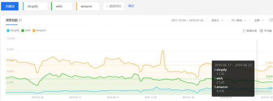 大家都知道现在独立站也特别火,那么独立站到底有多火呢?我们不妨通过百度指数的数据对比,一窥究竟。数据显示,2019年中Shopify(热门自建站工具)的百度搜索指数较去年同期上涨了110%。