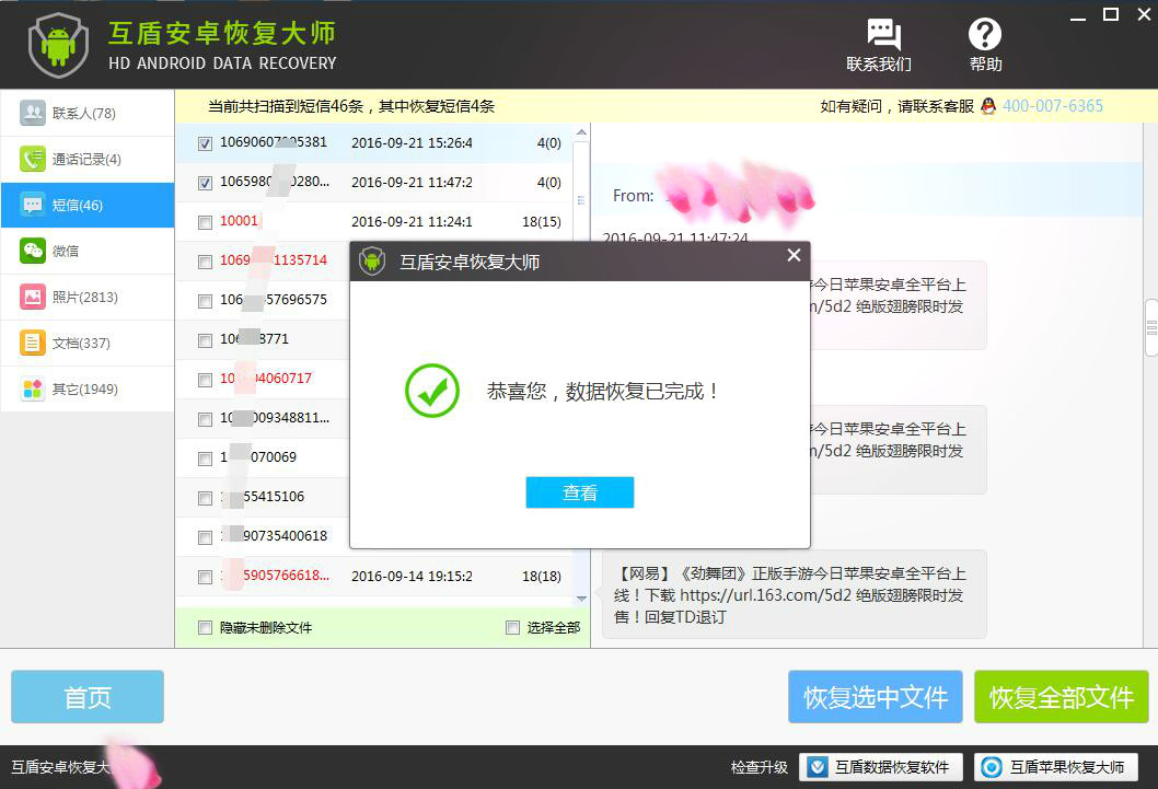 之后等扫描结束,我们可以选择自己需要的手机短信,之后我们点击恢复选中文件,之后我们便可以看到自己的手机短信了。