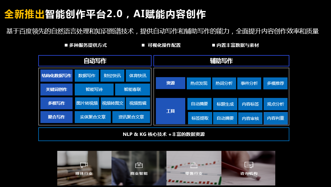 而此次重点介绍的智能创作平台2.0,正是集合了百度领先的自然语言处理、知识图谱以及大数据技术,可实现自动创作、辅助创作等功能。具体而言,智能创作平台2.0在创作前,能够提供实时领域热点、地域热点信息,同时对TOP热点事件提供Topic实时热度分析;创作中,能够预置素材数据,提供多模素材推荐,同时进行实时智能纠错;创作后,能够自动审校、自动标签分类,生成自动摘要,提供用词润色建议及多模发布功能。整个创作过程可节约大概80%的时间。