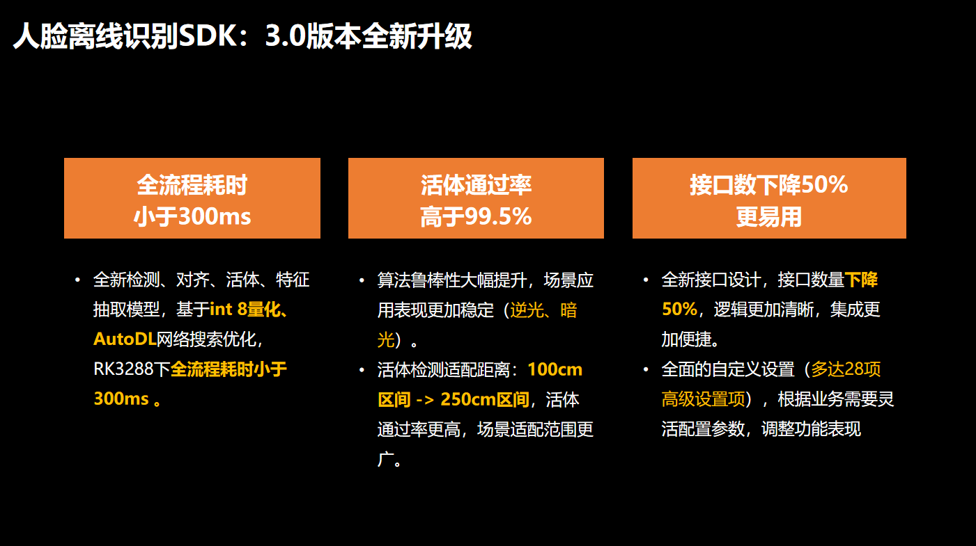 在视觉方向,人体分析与车辆识别方向有3项新能力开放包括:手部关键点识别、危险行为识别、车辆分割;3款产品能力升级包括:人体关键点识别、人流量统计、驾驶行为分析。更精细的关键点定位,将助力人机交互、互动娱乐等场景应用,而更丰富、精准的行为分析与识别能力,也将有效助力公共和交通安全。OCR方向,车牌、表格文字、通用文字(高精度/高精度含位置版)以及行驶证5款产品识别召回率均有不同程度的提升。同时人脸离线识别SDK升级至3.0版本,活体检测与通行全流程耗时低于300ms;人脸识别私有化部署包适配了最新的RTX系列2080显卡,并进一步提升模型性能。