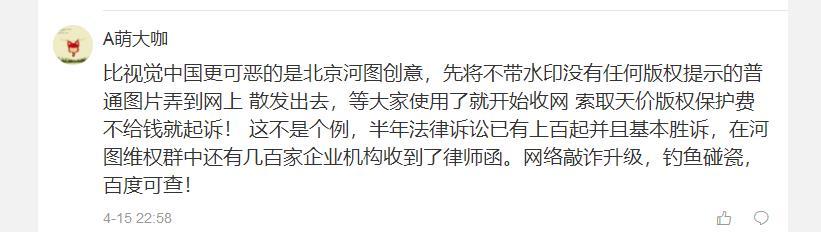 A萌大咖;比视觉中国更可恶的是北京河图创意,先将不带水印没有任何版权提示的普通图片弄到网上 散发出去,等大家使用了就开始收网 索取天价版权保护费 不给钱就起诉! 这不是个例,半年法律诉讼已有上百起并且基本胜诉,在河图维权群中还有几百家企业机构收到了律师函。网络敲诈升级,钓鱼碰瓷,百度可查!