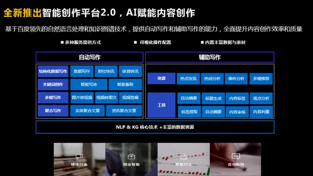 此外,百度自然语言处理部副总监忻舟宣布推出智能创作平台2.0,集合了百度自然语言处理、知识图谱以及大数据技术,可实现自动创作、辅助创作等功能。