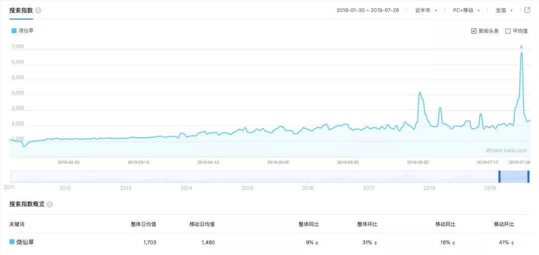 看第一张图,2019年2月~7月底,“烧仙草”三个字的搜索指数不断走高,6、7月份还迎来两个小高峰。