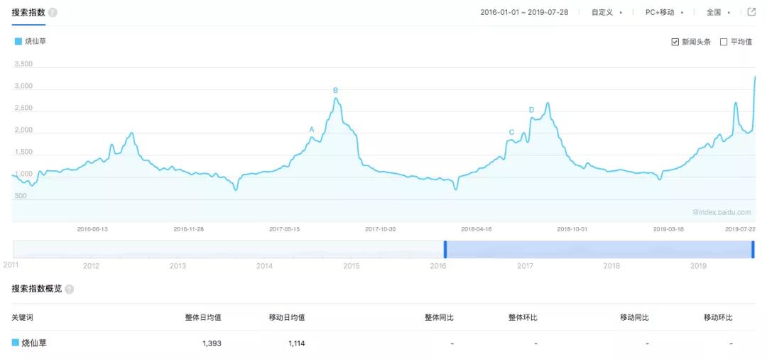 第2张图,把时间线拉长,2016年1月到2019年7月,烧仙草始终是个起伏状态,都会在夏季走高再降低。